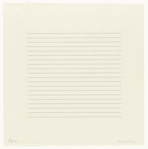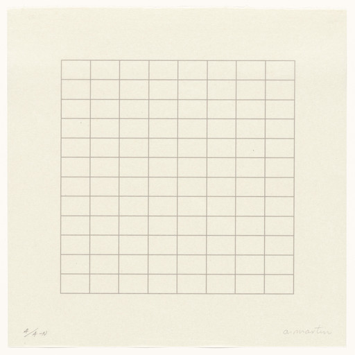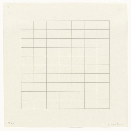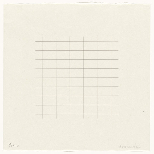 Over the course of the next decade, Martin developed her signature format: six by six foot painted canvases, covered from edge to edge with meticulously penciled grids and finished with a thin layer of gesso. Though she often showed with other New York abstractionists, Martin’s focused pursuit charted new terrain that lay outside of both the broad gestural vocabulary of Abstract Expressionism and the systematic repetitions of Minimalism. Rather, her practice was tethered to spirituality and drew from a mix of Zen Buddhist and American Transcendentalist ideas. For Martin, painting was “a world without objects, without interruption… or obstacle. It is to accept the necessity of … going into a field of vision as you would cross an empty beach to look at the ocean.”1