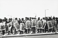 Black Panthers hold Free Huey signs at a rally at the Alameda County Courthouse where Black Panther Minister of Defense, Huey P. Newton, is on trial for killing an Oakland policeman, Oakland, California