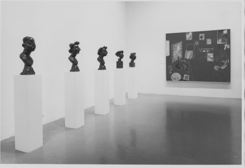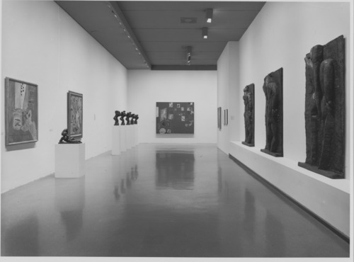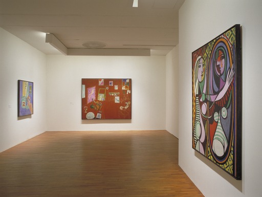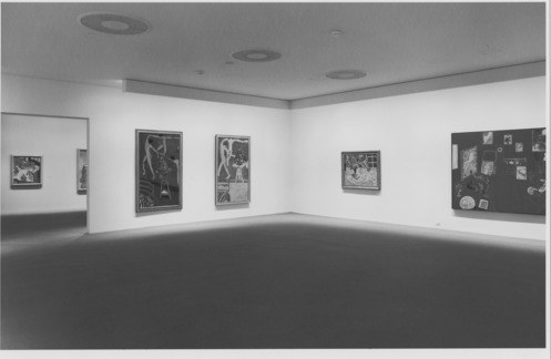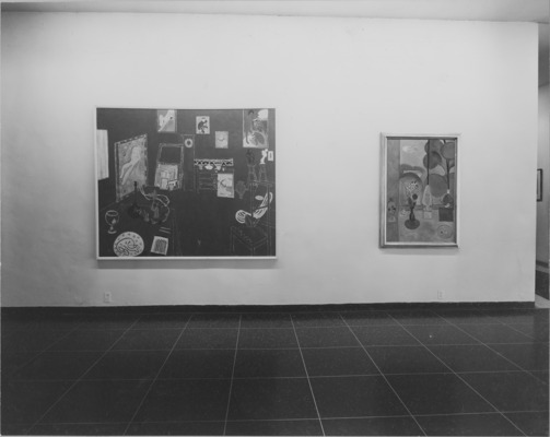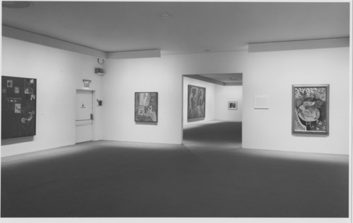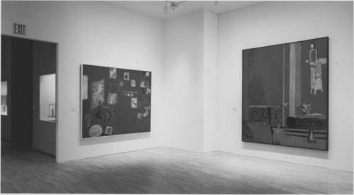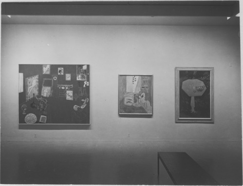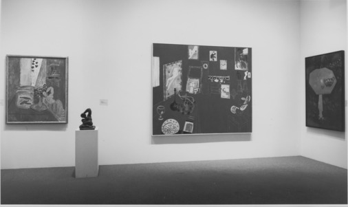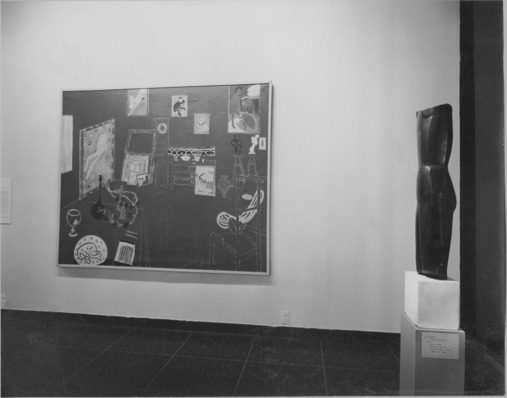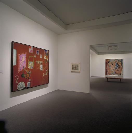 "Where I got the color red—to be sure, I just don't know," Matisse once remarked. "I find that all these things . . . only become what they are to me when I see them together with the color red." This painting features a small retrospective of Matisse's recent painting, sculpture, and ceramics, displayed in his studio. The artworks appear in color and in detail, while the room's architecture and furnishings are indicated only by negative gaps in the red surface. The composition's central axis is a grandfather clock without hands—it is as if, in the oasis of the artist's studio, time were suspended.