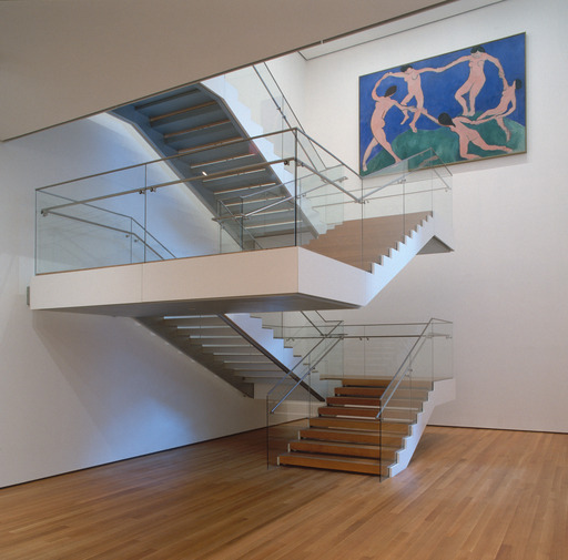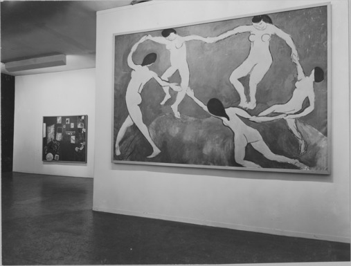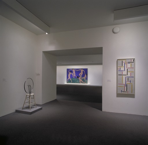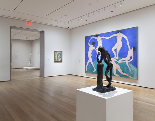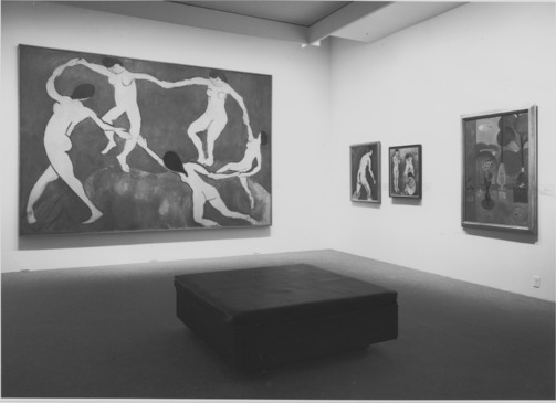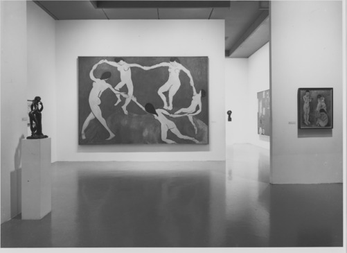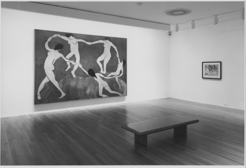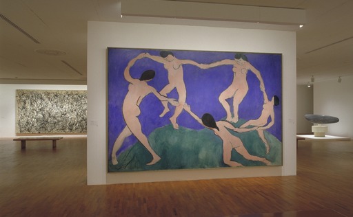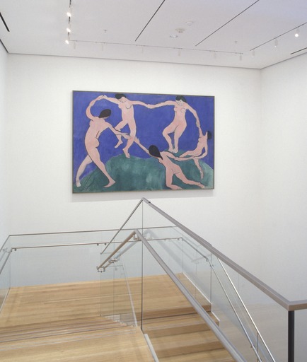 A monumental image of joy and energy, Dance is also strikingly daring. Matisse made the painting while preparing a decorative commission for the Moscow collector Sergei Shchukin, whose final version of the scene, Dance (II), was shown in Paris in 1910. Nearly identical in composition to this work, its simplifications of the human body were attacked as inept or willfully crude. Also noted was the work's radical visual flatness: the elimination of perspective and foreshortening that makes nearer and farther figures the same size, and the sky a plane of blue. This is true, as well, of the first version. Here, the figure at the left moves purposefully; the strength of her body is emphasized by the sweeping unbroken contour from her rear foot up to her breast. The other dancers seem so light they nearly float. The woman at the far right is barely sketched in, her foot dissolving in runny paint as she reels backward. The arm of the dancer to her left literally stretches as it reaches toward the leader's hand, where momentum has broken the circle. The dancers' speed is barely contained by the edges of the canvas. Dance (II) is more intense in color than this first version, and the dancers' bodies—there deep red—are more sinewy and energetic. In whatever canvas they appear, these are no ordinary dancers, but mythical creatures in a timeless landscape. Dance, Matisse once said, meant "life and rhythm."