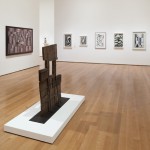 Left: Historic photograph of St. Marks Tower model on display at the Art Institute of Chicago, 1930. Frank Lloyd Wright Foundation Archives (The Museum of Modern Art and Avery Architectural and Fine Arts Library, Columbia University, New York); Right: St. Marks Tower Model at MoMA, before treatment, 2013