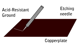 In areas where drawing takes place, the acid-resistant ground is removed by the etching needle. This removal allows areas of the copperplate to be exposed.
