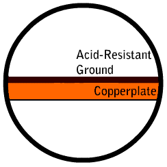 In areas where drawing takes place, the acid-resistant ground is removed by the etching needle. This removal allows areas of the copperplate to be exposed.