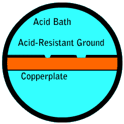 The plate is next submerged in a pan of acid, the "acid bath." The acid fills in the cut-away lines in the ground, touching the copperplate. Those areas are incised (or "bitten"), while the areas of the plate covered in acid-resistant ground are protected. |