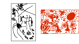 Miró inks the first coppeplate in black and rotates it 90 degrees clockwise. He then prints it over a red impression of the second copperplate to create
