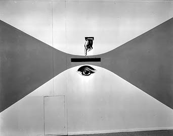 | Installation view, "Bauhaus: 1919-1928." December 7, 1938 through January 30, 1939. Photograph ©1999 The Museum of Modern Art, New York Peephole through which can be seen revolving figures wearing costumes from the "Triadic Ballet". |