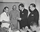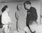"Major General Norman T. Kirk, Surgeon General of the United States, and Nelson A. Rockefeller discuss with war veteran his work in the sculpture and Ceramics Class at the War Veterans' Center," during the opening of the exhibition, "Art for War Veterans" (24 of 27)